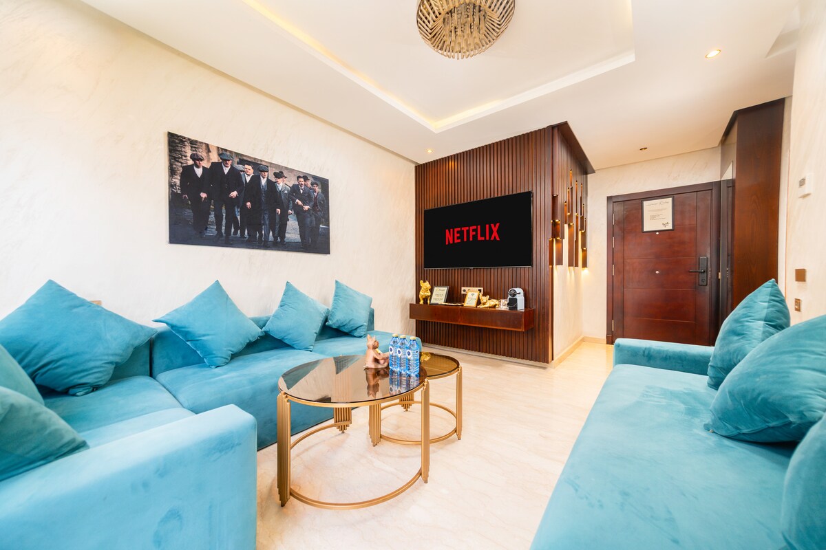 Détendez-vous dans cet appartement calme et élégant, situé dans une résidence sécurisée avec piscine. Spacieux (64 m²), il comprend une chambre, un salon avec espace de travail, balcon, cuisine équipée, fibre optique et IPTV (chaînes internationales, films, séries). Linge de lit fournis. couples marocains non mariés interdits. Idéalement situé, proche de toutes commodités (supérettes, cafés, restaurants), parfait pour un séjour reposant. Piscines non disponibles jusqu’à mars 2026