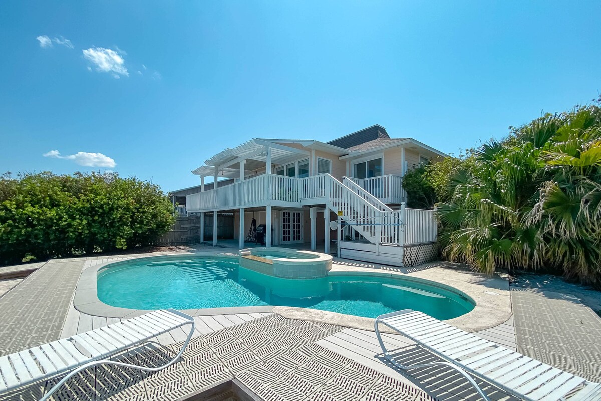 Welcome to Driftwood Cove! Escape the crowds and bask in the serenity of your own secluded beach retreat by the coveted Surfside Shores! Wake up to breathtaking sunrises while sipping your favorite beverage from the expansive second-story porch. After a day of sun, sand, and sea, return home to fire up the grill for a family BBQ or unwind beside the large, 15 x 30 heated pool, complete with plenty of space to lounge and play.
