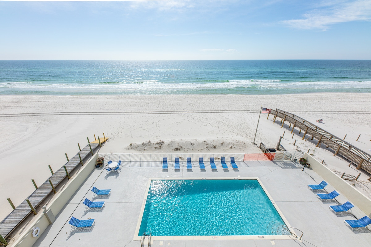 Gulf Shores Paradise ~ Nous sommes au 4e étage à Surfside Shores ~ Réveillez-vous chaque matin avec une vue imprenable sur l'océan, les piscines, et terminez chaque journée avec les magnifiques couchers de soleil que l'on ne voit qu'à la plage. Vous vous sentirez choyé avec votre balcon privé en bord de mer à l'extérieur de votre première suite parentale ainsi que du salon. Profitez d'une belle vue sur Little Lagoon depuis la deuxième suite. Cet appartement est idéal pour les familles ou deux couples. Peut accueillir confortablement 6 personnes. WiFi gratuit. Géré par le propriétaire. Propre.