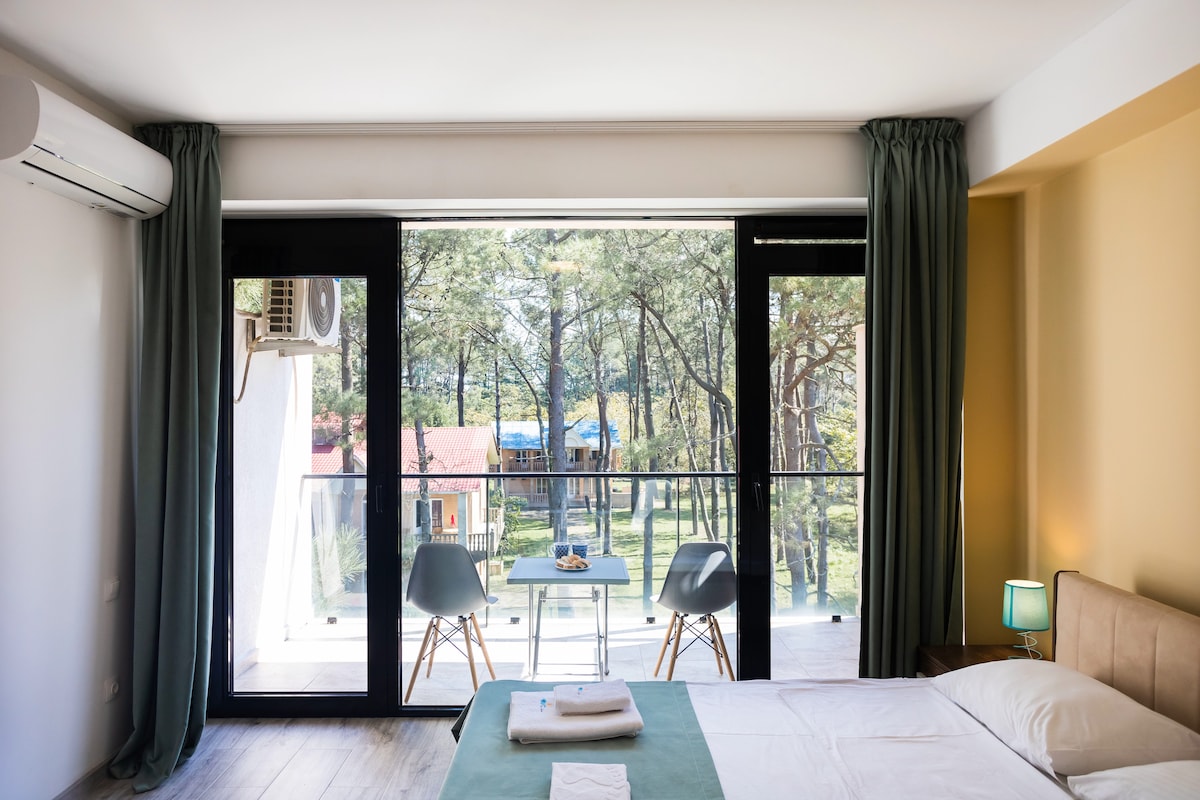 Superior Family room with a balcony in the new hotel "Golden Lion" built in 2019. First line, balcony. Third floor. Outdoor swimming pool. Comfortable rooms, air сonditioning, shower,toilet, mini frige,kattle, TV, WIFI. First line, balcony facing the street, partially visible sea, pine forest. Breakfast can be ordered. Large yard, BBQ. Free parking. To the sea 150 m. Near the pine forest, playground. Shops,cafe,pharmacy. We speak english.