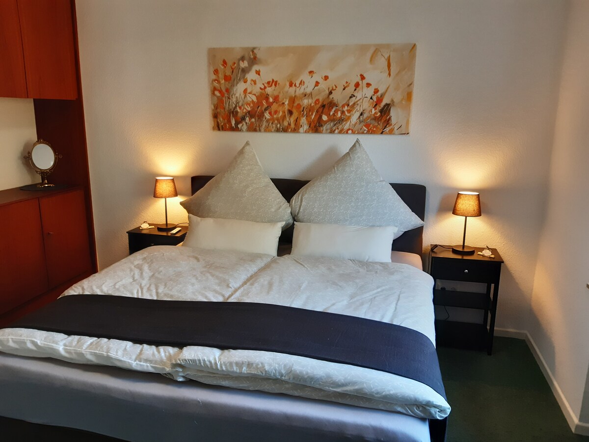 Confortable appartement de 45 m² séparé et lumineux (souterrain) avec une chambre avec lit double, salle de bains et cuisine-salle à manger. Buanderie avec machine à laver et sèche-linge. Vous allez adorer notre petite terrasse ensoleillée où vous pourrez déguster votre café du matin. Depuis mars 2021, nous accueillons des clients Airbnb.