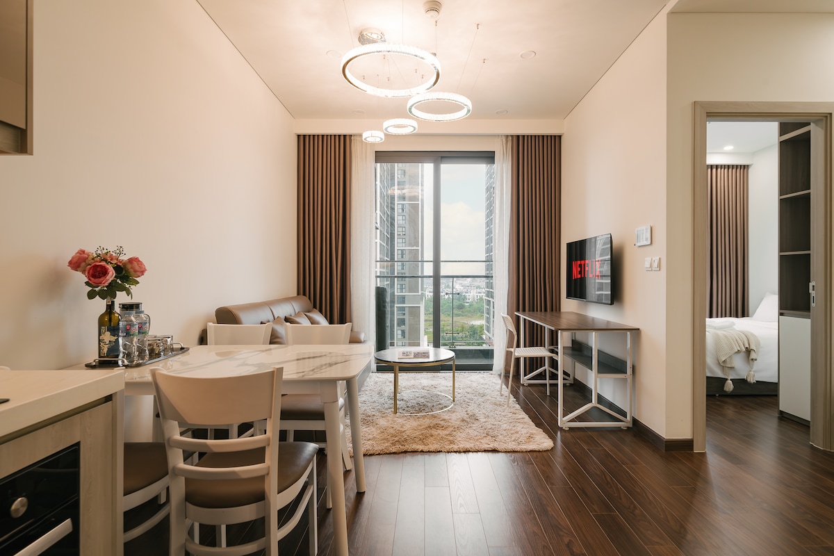 Căn hộ sang trọng với view hồ bơi và skyline rộng mở, được thiết kế theo tông be – nâu tinh tế và ngập tràn ánh sáng tự nhiên. Không gian gồm 1 phòng ngủ riêng, 1 phòng ngủ phụ kín rèm, phòng khách hiện đại và bếp đầy đủ tiện nghi. Nằm trong khu đô thị cao cấp với an ninh 24/7 và nhiều tiện ích, căn hộ là lựa chọn hoàn hảo cho du khách, cặp đôi hoặc khách công tác.