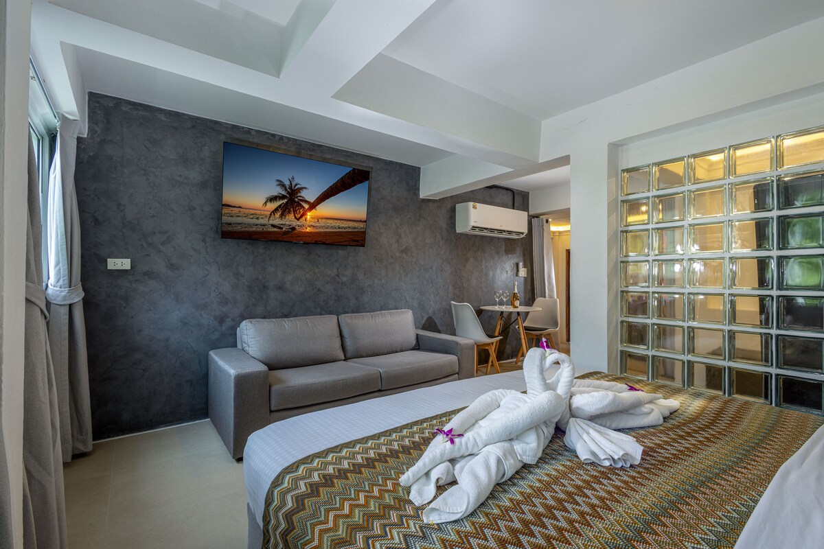 À seulement 30 M(1 min à pied)de la plage, suite neuve de 110 m ² avec vue sur la mer au coucher du soleil. 3 climatiseurs comprenant 2 chambres climatisées avec un grand espace. Chambres avec lit King Size dans chaque chambre et une armoire dans chaque chambre + 1 douche + toilettes et salon de climatisation, y compris une table et des canapés, une cuisine entièrement équipée, y compris une table + 4 chaises. Un immense balcon de 36 m avec des prises électriques, table et chaises, +matelas+oreillers face au coucher de soleil coloré et au golf de Thaïlande. Un min à pied de la piscine et du restaurant. Place de parking pour voiture/motos
