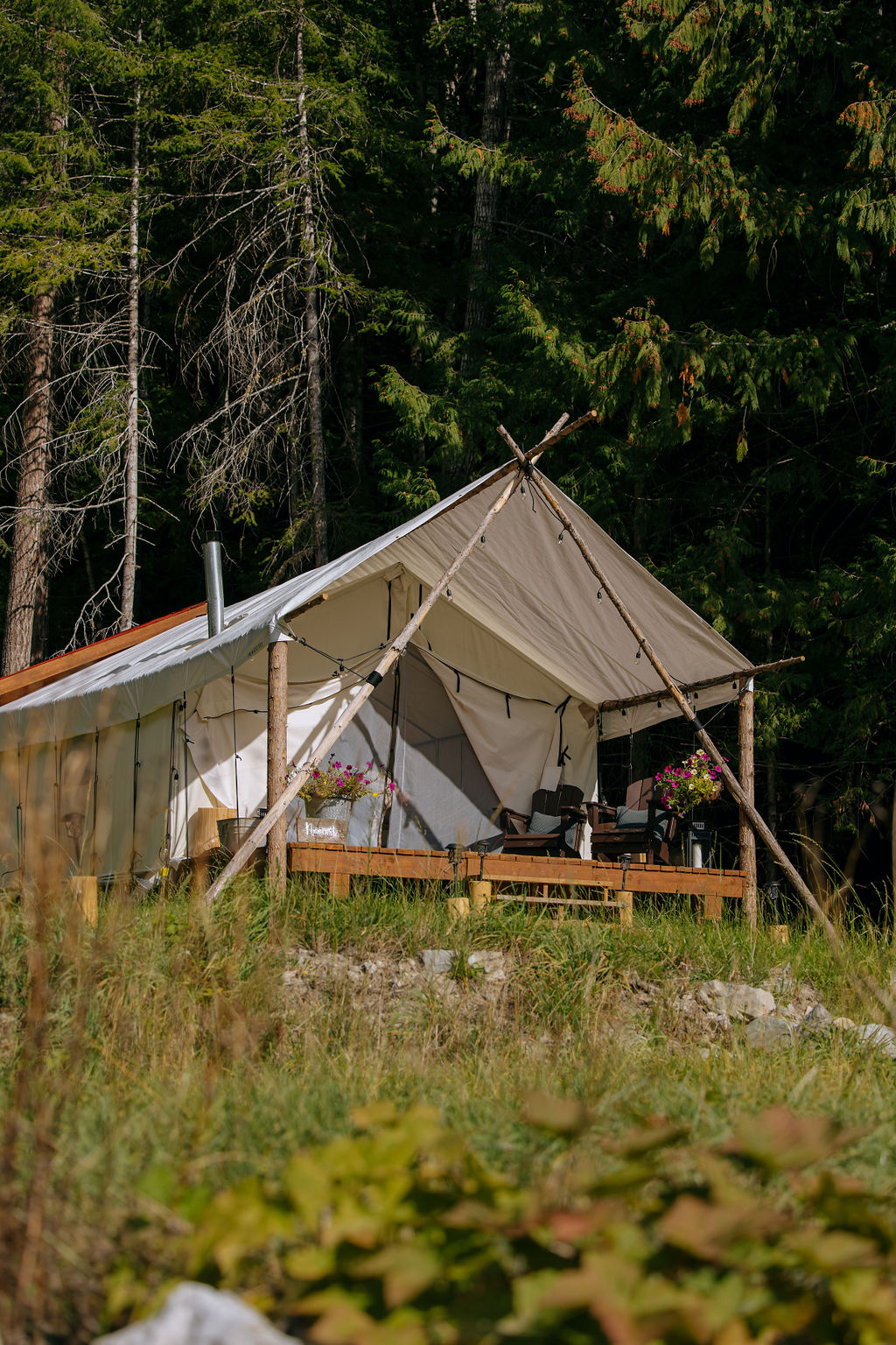 La tente murale Noomst est une tente murale de luxe confortable de 16 x 14 avec un auvent prolongé de 8' et une salle de bain attenante. La salle de bain a un lavabo et des toilettes et a accès à une douche extérieure privée avec vue sur les cimes des sapins de Douglas au-dessus de vous. Le porche privé de 14' x 8' offre une vue sur la propriété et les montagnes côtières. Les tentes murales ont accès au pavillon de barbecue pour préparer et stocker les aliments.