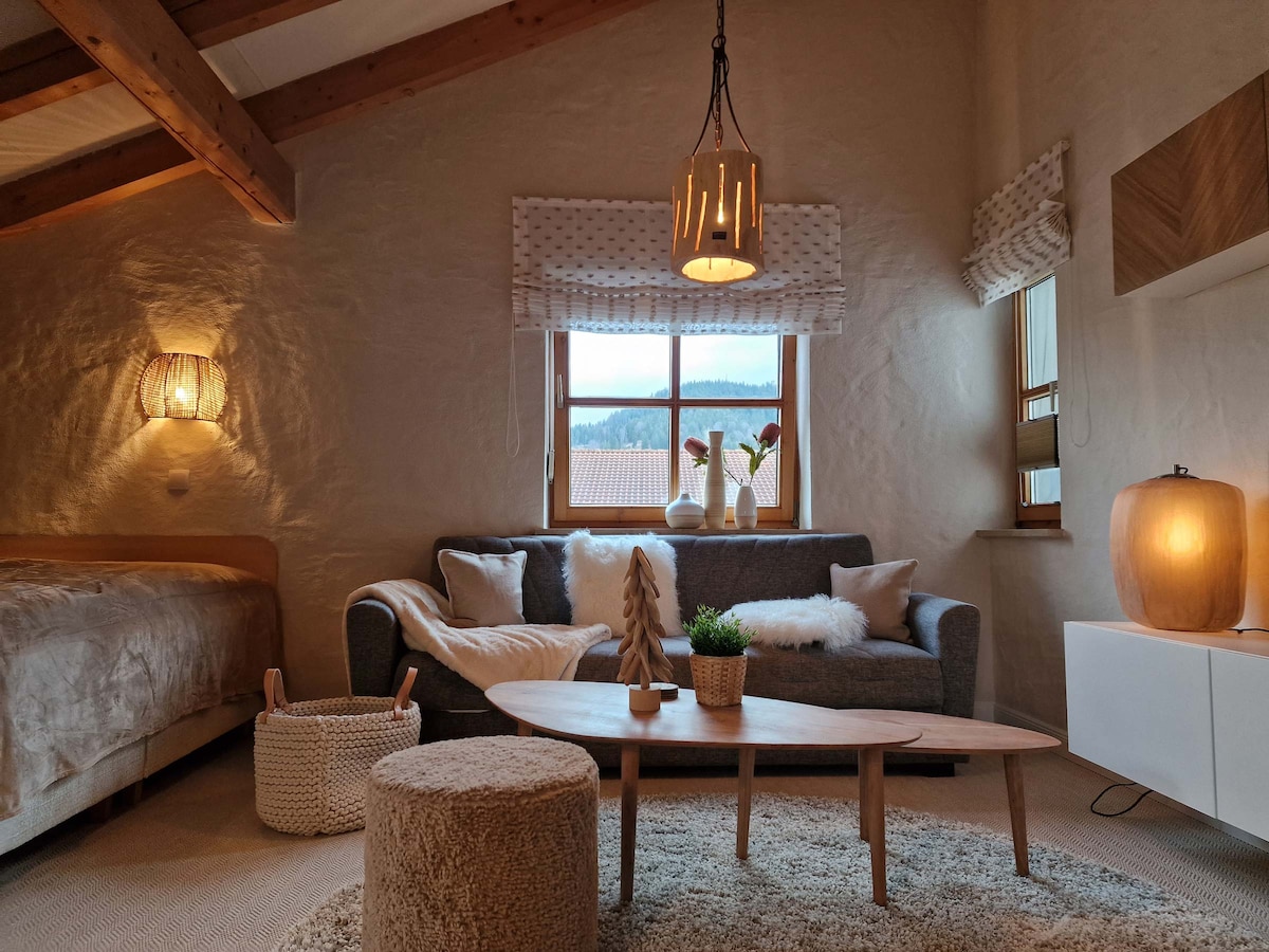 Niché au cœur du paysage montagneux à couper le souffle de la région de l'Allgäu, dans le pittoresque village sinueux de Hinterstein, se trouve un charmant et confortable appartement de vacances d'une pièce dans une maison alpine traditionnelle. Des éléments en bois récupéré, des fourrures, de l'ardoise, des branches et des arrangements floraux se réunissent ici, et aucun détail n'a été négligé avec une attention particulière aux détails ♥.