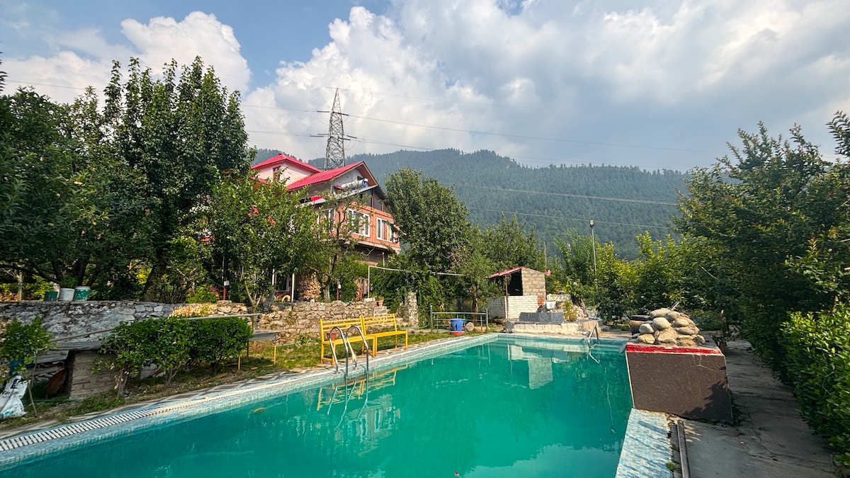 Escape to our 1 Bedroom Cottage in Manali, nestled in serene apple orchards. This cozy attic-style retreat features antique furnishings and modern amenities, including a king-size bed, dining area, and balcony with stunning views of the orchards, mountains, and Beas River. Ideal for couples or small groups (up to 3), it offers a bedroom upstairs and a lounge with a plunge pool downstairs. Relax with cocktails by your private pool and soak in the beautiful natural surroundings.