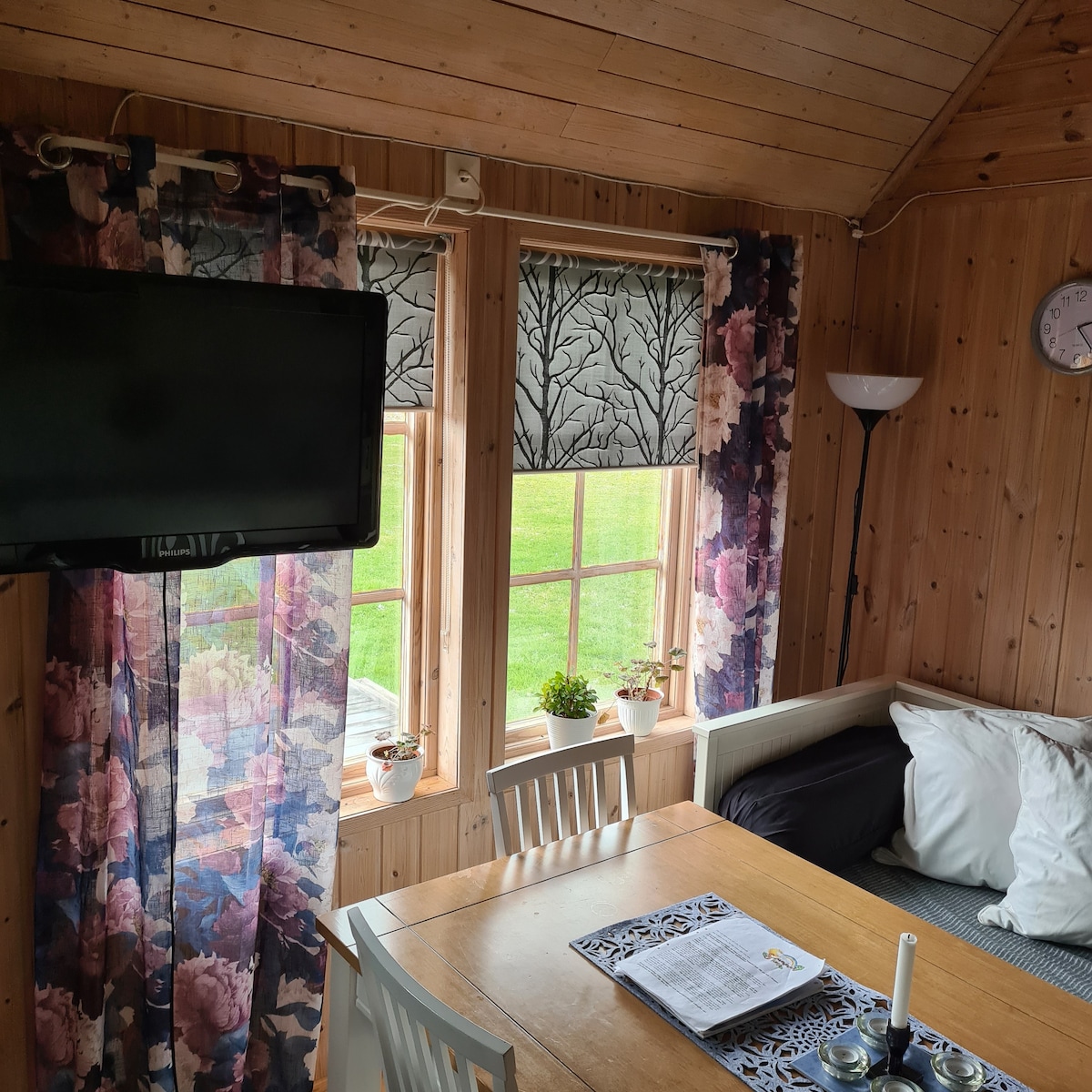 Le chalet est de 30 m ² et hiverné avec grenier-lit (je pense qu'il n'est pas adapté aux enfants de moins de 7 ans) car les escaliers sont très raides. À l'étage, il y a 1 lit et 1 matelas. La douche elle-même est petite mais elle remplit bien sa fonction. Mais peut également se doucher dans la nouvelle zone de douche qui est dans le Boden non peint et il y a aussi le sèche-cheveux ! Grande cour arrière avec de la place pour les activités. Parking juste à côté de la cabane à côté de la terrasse sur le côté droit. Commerces, restaurants sont situés à Lärbro à environ 4 km.