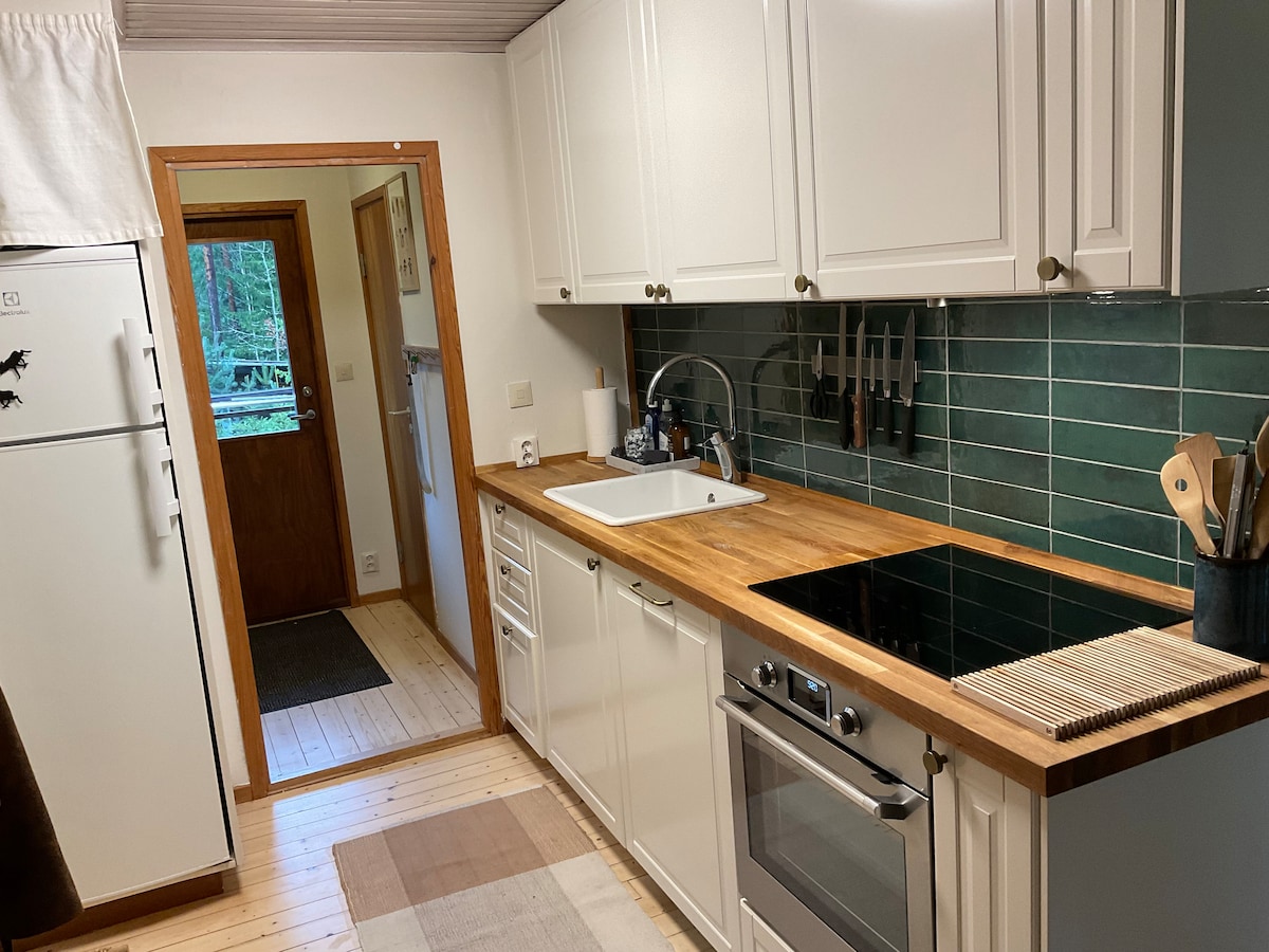 Éloignez l'environnement paisible et calme dans la nature depuis ce chalet neuf. Le chalet dispose d'une chambre et d'un loft avec deux lits. La cuisine dispose de tout ce dont vous avez besoin, comme une cuisinière, un four, un four à micro-ondes, un réfrigérateur et un congélateur. Veuillez apporter vos propres draps. Il est possible de louer des draps pour 100 SEK/personne.