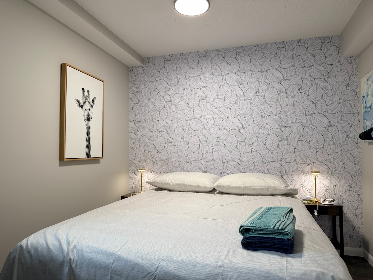 Profitez d'une expérience élégante dans cette suite au 2e étage située au centre. Une entrée latérale privée avec un digicode mène à l'étage à cette suite d'inspiration rétro. À distance de marche des restaurants, épiceries, cafés, stades (Bengals 2,3 miles, Reds 1,8 miles), Ovation (1,4 miles), Newport on the Levee (1 mile). Borne de recharge pour véhicule électrique disponible. Douche de luxe, vue sur la ligne d'horizon de Cincinnati depuis la chambre. Juste à côté de l'autoroute, un emplacement idéal pour tout faire. AUCUN animal de compagnie.