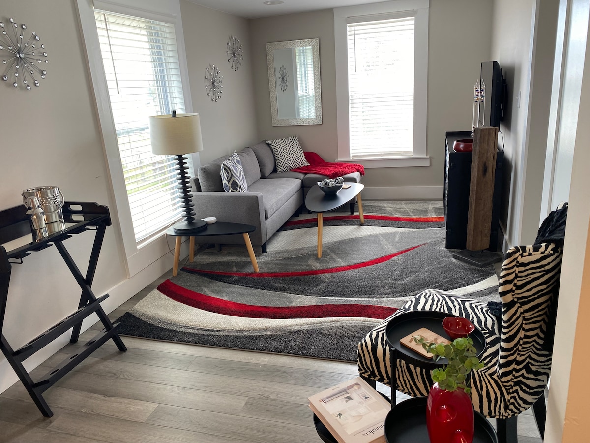 Tout ce dont vous avez besoin pour vous détendre et vous ressourcer dans un espace confortable. Entrée privée. Cette suite est un espace ouvert avec une petite kitchenette qui comprend un réfrigérateur, un four à micro-ondes et une cuisinière avec des ustensiles de cuisine et de la vaisselle de base. Elle est située en ville à proximité des magasins, des restaurants. Joli patio à l'arrière avec zone couverte pour faire des grillades. À distance de marche du North Country Trail et à 10 min du nouveau Dragon Trail. Il y a un lit Queen Size et un canapé. Il peut accueillir confortablement deux voyageurs.