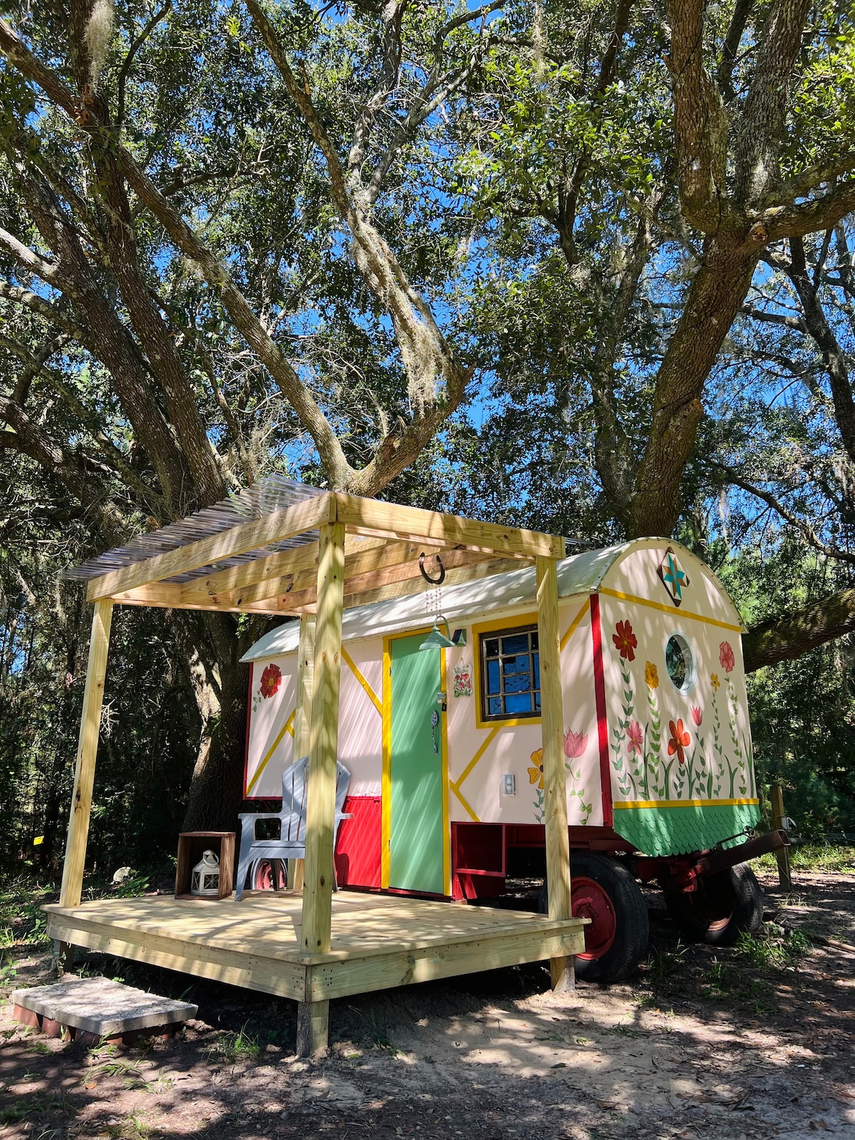 Notre roulotte est juste en dessous d'un chêne vert recouvert de mousse et de lumières. Dans notre wagon unique, vous avez un espace de couchage confortable avec une belle vue sur notre ferme. Le bain public est partagé et se trouve à seulement 100 pieds de votre porche. Profitez de nos ânes, poulets, cochons, canards, chèvres et chats en liberté. Le wagon est un petit espace. Le plafond au milieu mesure 6,2 pieds de hauteur. Le matelas a été fait sur mesure pour s'adapter à l'espace des wagons. Le matelas mesure 6 pi de long et 54 po de large, soit entre un lit simple et un lit double.