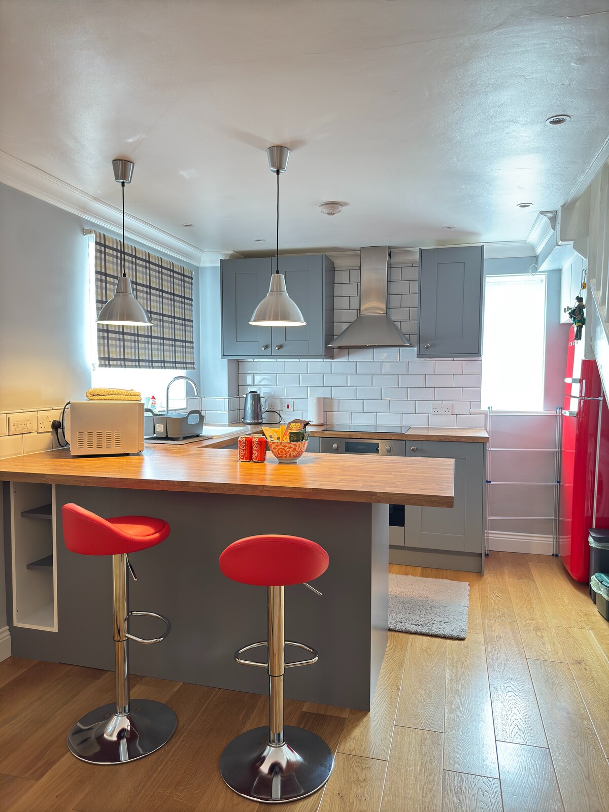 Notre annexe spacieuse de 2 chambres récemment rénovée est située dans une large rue bordée d'arbres, un emplacement privilégié à seulement quelques minutes à pied des charmants cafés, boutiques et restaurants de Hampton Court Village, du palais de Hampton Court et de la gare locale. Adjacent mais détaché de notre élégante maison familiale victorienne, cet espace lumineux et élégant est tranquille et indépendant et bénéficie des avantages supplémentaires d'un jardin patio privé orienté sud et d'un espace de stationnement dédié hors de la rue.