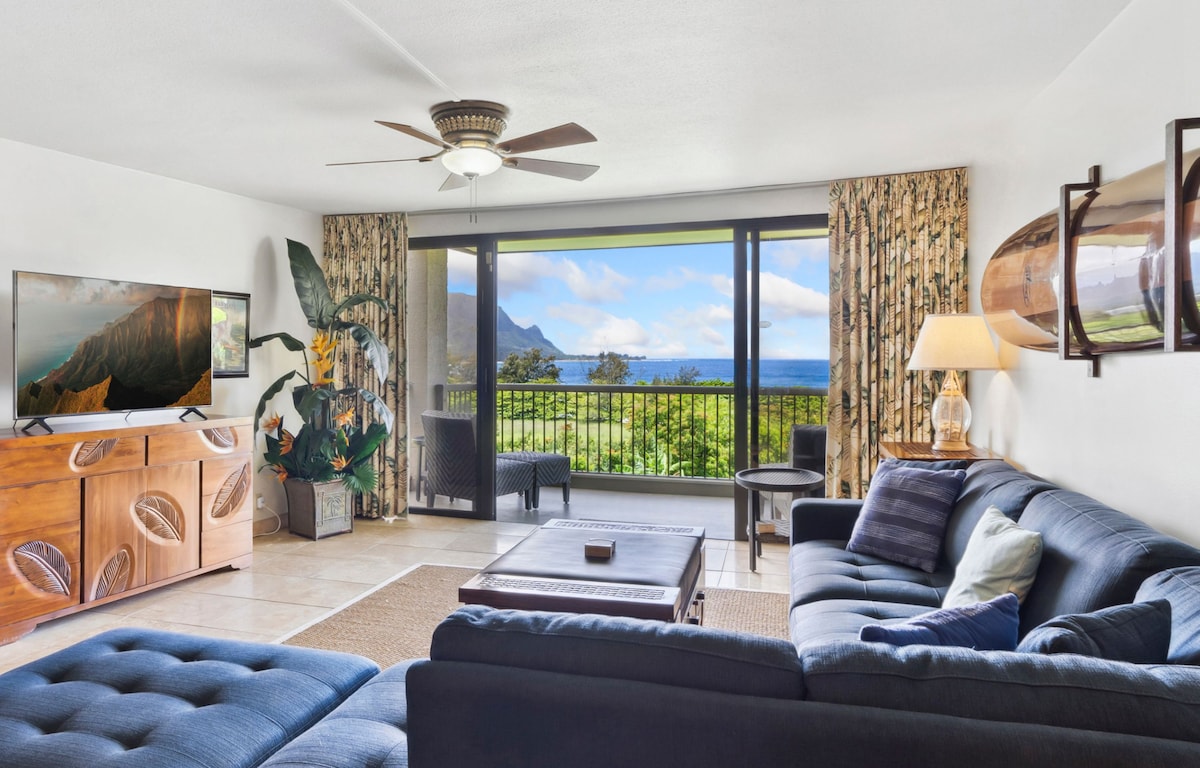 Cette retraite de plage de lune de miel moderne et récemment rénovée offre une vue panoramique imprenable sur l'océan et le littoral. Détendez-vous dans le lit de jour tout en admirant la vue panoramique sur le récif d'Anini et le phare de Kilauea. Certains ont dit « on a l'impression d'être sur un bateau en mer » en voyant des baleines sauter dans l'océan et les vagues se briser sur le récif depuis cet endroit magique. Un penthouse rare avec de hauts plafonds, des vues depuis chaque pièce, même le célèbre Bali Hai depuis la terrasse. Vraiment le rêve d'un couple !