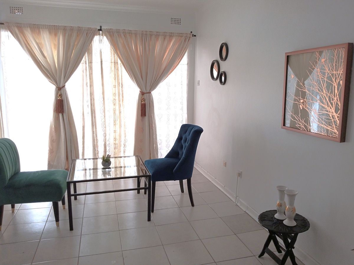 Une suite exécutive dans un quartier verdoyant avec un beau jardin bien entretenu, un foyer et une cuisine extérieure braai. Il y a la DSTV et une connexion Wi-Fi illimitée avec une alimentation de secours solide, y compris la télévision et les lumières. L'endroit est d'une propreté éclatante avec toutes les commodités modernes. C'est du premier ordre. Des repas à des prix très raisonnables peuvent être organisés pour les séjours longue durée. Il vous suffit de faire vos valises et de venir vous détendre.