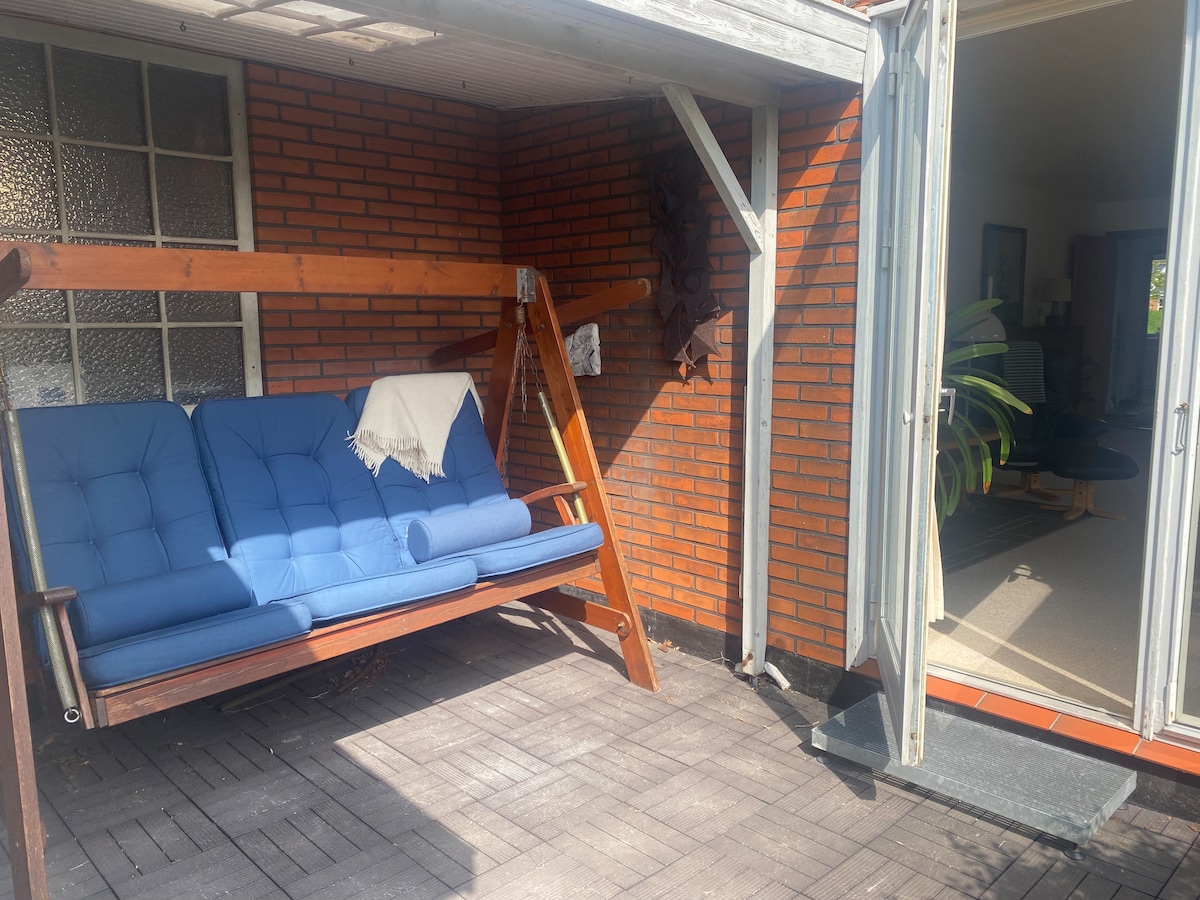 Appartement de vacances confortable au 1er étage d'une belle villa plus ancienne. L'appartement comprend deux chambres, un salon avec sortie sur un petit balcon, ainsi que sa propre cuisine et salle de bain. Il y a de la place pour 4 personnes - plus toute la literie supplémentaire sur un bon canapé convertible dans le salon. La cuisine contient une cuisinière/four, un réfrigérateur, une cafetière, une casserole et bien sûr, divers ustensiles et plats. L'accès au lave-linge/sèche-linge peut être aménagé au sous-sol de la maison. Entrée par l'entrée de la maison, mais en plus, c'est un appartement séparé.