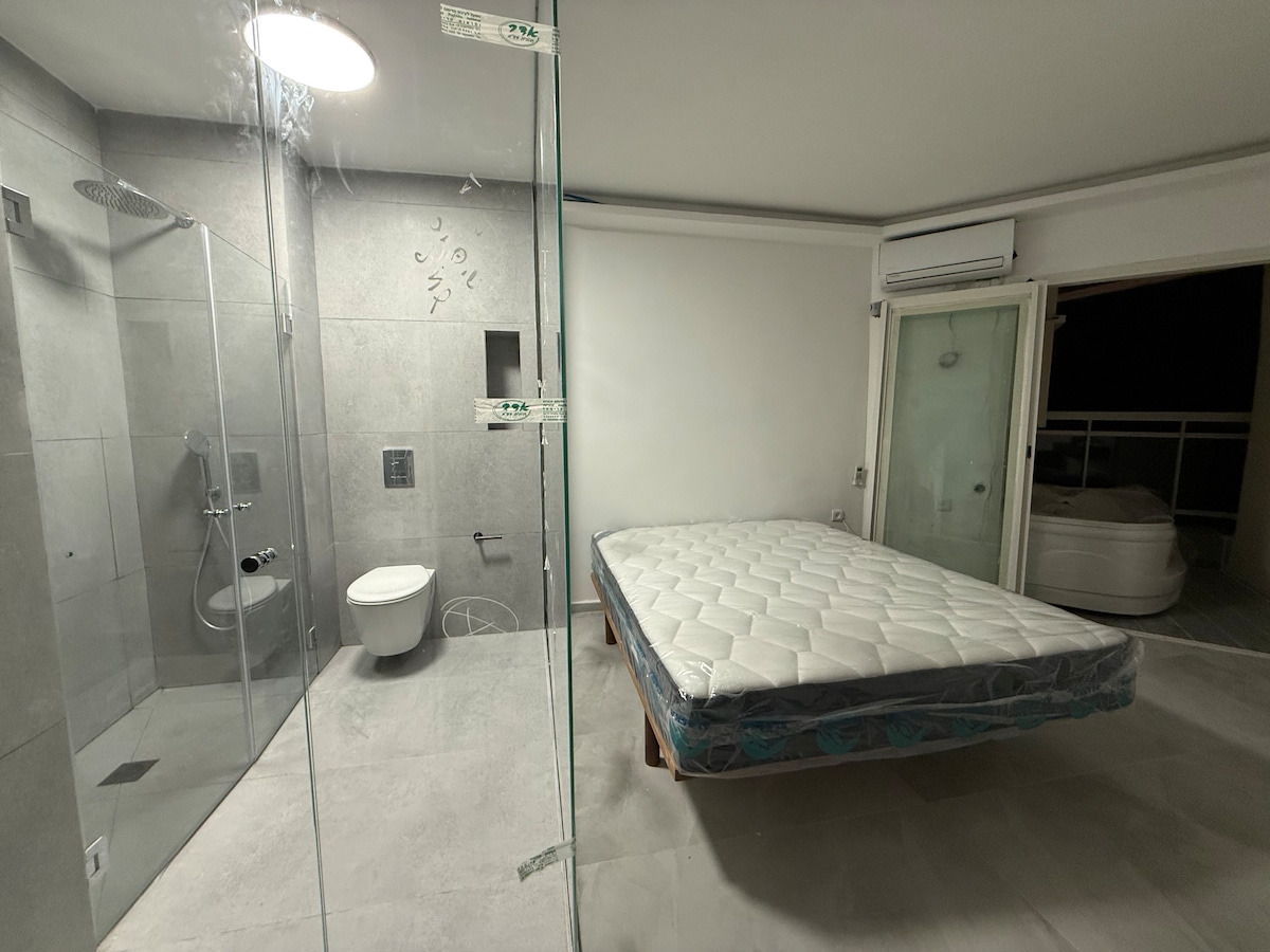 Ce mini penthouse récemment rénové (2020) et climatisé (50m2) se trouve au 7ème étage dans le centre de Netanya (quartier calme), près de la plage. L'appartement est accessible par un ascenseur(pas d'ascenseur shabbat) et dispose de sa propre entrée. Le penthouse dispose d'un toit privé terrasse (10m2) avec vue sur le soleil et la mer. La salle de bains dispose d'une douche à effet pluie. La plage est accessible à pied en 5 minutes et à 10 minutes du kikar ha'atmaut. Les supermarchés, la gare routière et le centre commercial sont accessibles à pied.