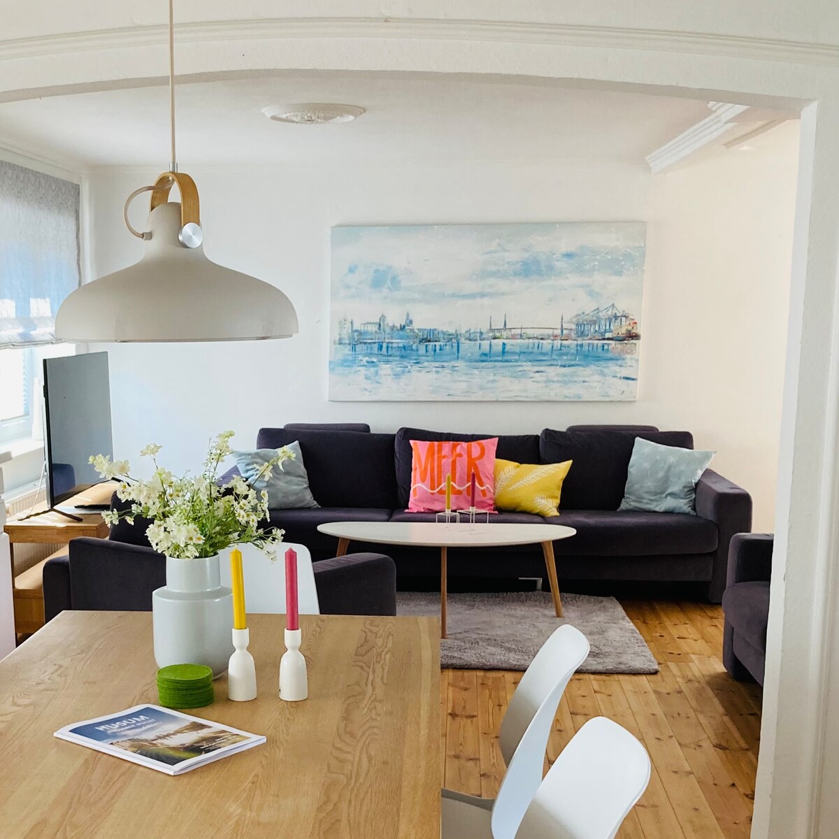 Nous avons un appartement de 3 pièces de 65 m², au rez-de-chaussée, et situé au centre de Husum. En face se trouve le parc du château avec avec le château de Husum, célèbre pour la floraison annuelle des crocus. Dans le parc du château, vous pouvez faire du jogging, nourrir les canards ou boire un café dans le château. Dans le parc, il y a aussi des équipements de fitness en plein air que tout le monde peut utiliser gratuitement. Dans la maison de la tour se trouve à l'étage supérieur. encore un autre appartement. La ville et le port sont à distance de marche en 8 minutes. Le parking est devant la maison.