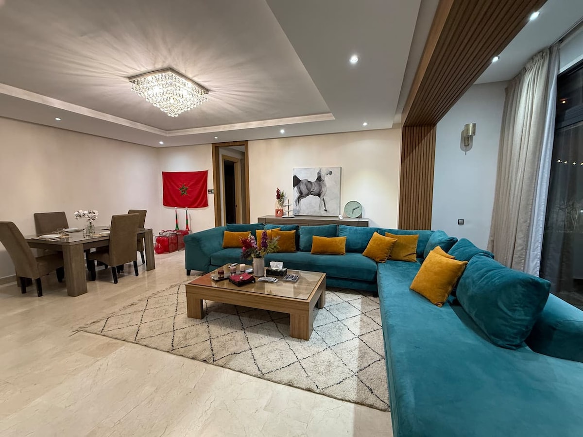 Élégant 90 m² Appartement avec un Salon spacieux et une grande suite parentale. Spacieux et confortable, idéal pour les couples, familles et voyageurs d’affaires ✅ Self check-in 24h/24 ✅ Terrasses dans tout le logement ✅ Résidence sécurisée+parking ✅ Wifi/Netflix/IPTV ✅ Cuisine équipée, 2 salles de bain 🔆 Vue panoramique depuis la suite parentale Emplacement stratégique : à seulement 5 minutes à pied du stade Prince Moulay Abdellah, parfait pour ne rien manquer des matchs de la CAN 2025