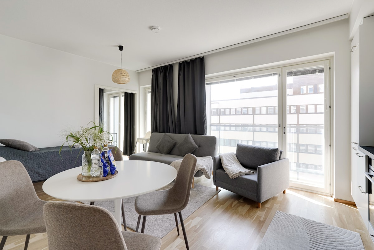 Studio neuf, élégant et frais avec vue sur la ville et la mer. Grand balcon orienté sud. Fenêtres du sol au plafond orientées est et sud. Jeune et branché quartier de Kalasatama/Sompasaari à Helsinki. L'appartement est au bord de la mer, à seulement 5 minutes à pied des plages de sable, de la nature et des terrains de sport de Mustikkama. À proximité du centre commercial Redi, du zoo de Korkeasaari et du centre de restauration et d'événements Teurastamo. Arrêt de bus à 20 mètres et station de métro la plus proche Kalasatama.