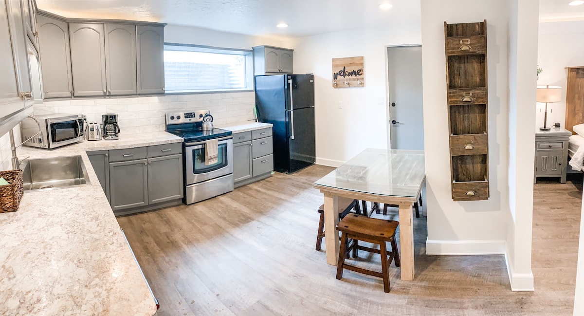 Ce studio moderne ouvert et rafraîchissant se trouve à quelques pâtés de maisons de Porter Park et à 3 pâtés de maisons du campus BYU-Idaho. Dès que vous entrez dans l'appartement, vous sentez la lumière douce des immenses fenêtres et vous vous demandez... est-ce vraiment un sous-sol ? Vous trouverez une salle de bain de luxe équipée de jets corporels, d'une douche à effet pluie et d'une baignoire profonde remplie par un bec verseur en cascade. Le lit est merveilleusement confortable avec un surmatelas respirant et moelleux. Vous pouvez même vous blottir contre le feu ou profiter de vos émissions préférées sur la télévision connectée !