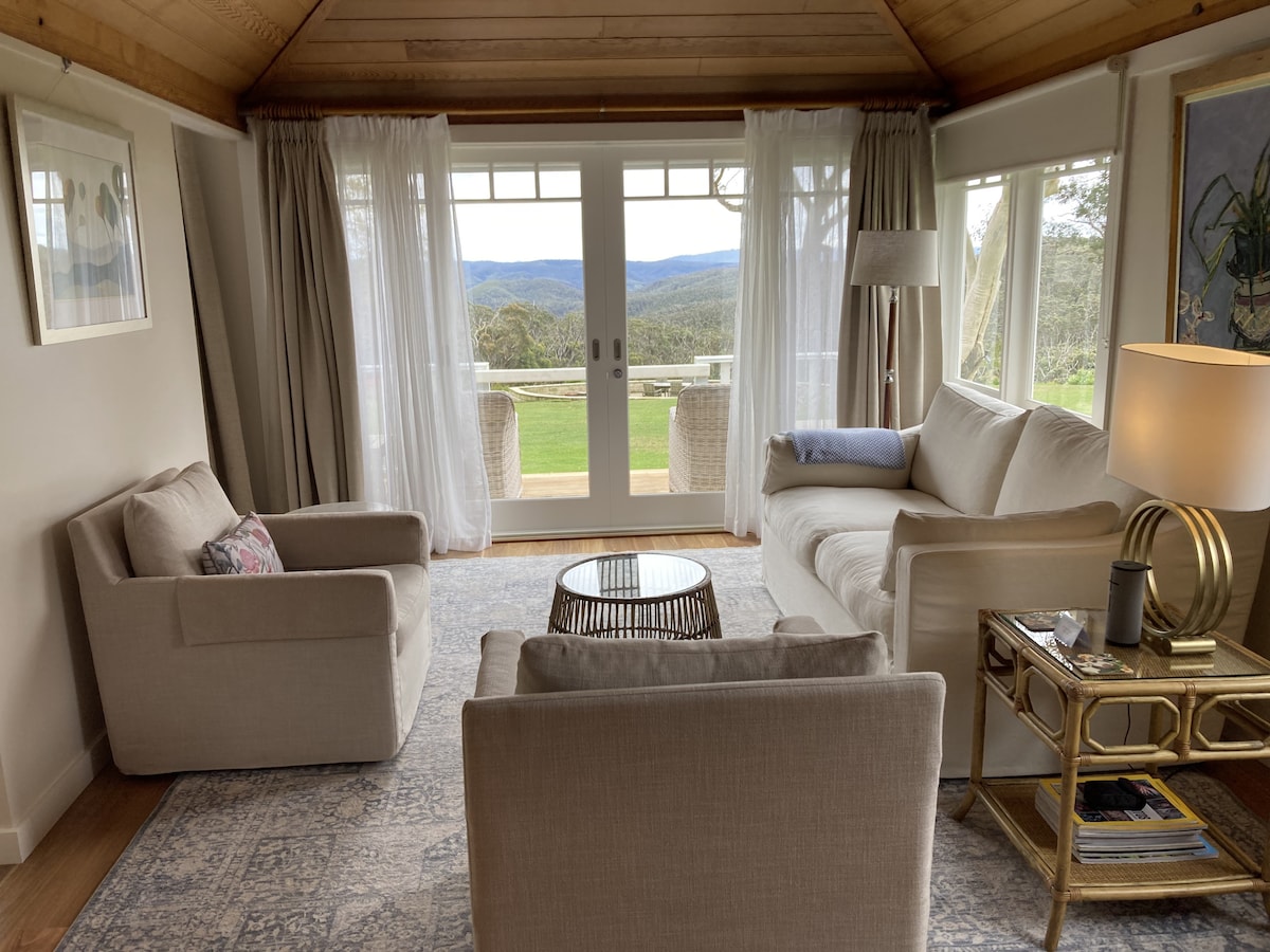 Découvrez la beauté, le calme et la paix dans ce chalet luxueux et magnifiquement stylé pour deux adultes. Détendez-vous devant le feu de bois crépitant avec un verre de vin ou une tasse chaude. Détendez-vous dans le bain à remous et endormez-vous la nuit dans le luxueux lit King Size avec son linge blanc neigeux. Réveillez-vous avec une vue spectaculaire sur la montagne et la vallée tout en profitant de votre petit-déjeuner en regardant par les immenses baies vitrées. Dites bonjour à la faune locale, y compris les kangourous et les canards en bois, et soyez simplement vous-même.