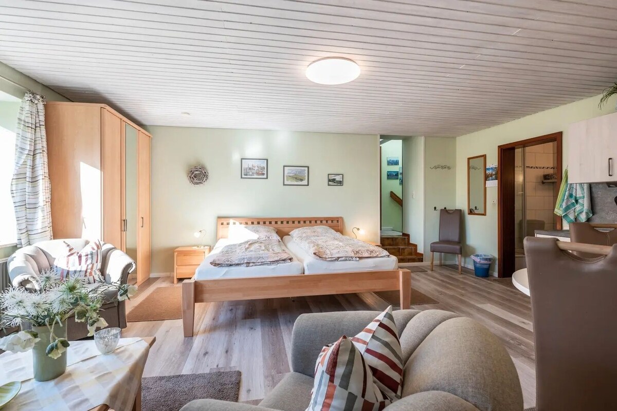 Appartement mansardé romantique pour couples, célibataires & workation à Dithmarschen/SH ! Le concept de salon et de salle de bain ouvert offre beaucoup d'opportunités pour être ensemble et de l'espace pour travailler. Les toilettes se trouvent dans une pièce séparée. Depuis le salon-chambre à coucher, les clients ont une vue dégagée sur la zone de douche. Le décor a été réalisé par nos soins avec amour. Un mélange de vieux meubles, de créations personnelles et d'appareils modernes donne à l'appartement un charme très particulier. Situation calme dans le village !