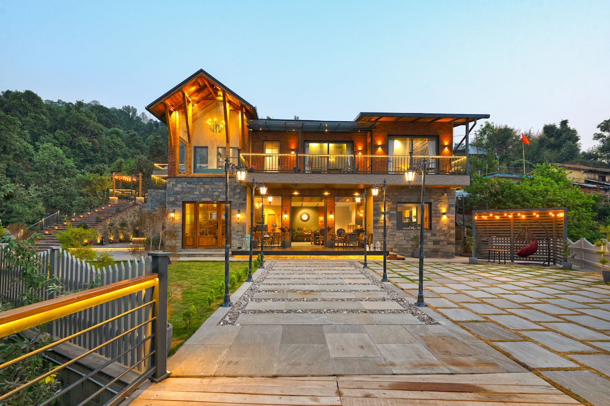 Aruunoday is a cozy luxe 5BHK villa in Bhimtal, near Naukuchiatal, perfect for families and friends. Soak in breathtaking mountain views from the infinity deck, enjoy movie nights in the private theatre, and spend fun-filled hours in the games room. Curl up with a book in the peaceful library or gather around for bonfires and barbecues under the stars. This charming Bhimtal getaway promises a relaxing and joy-filled escape, just a drive away from Delhi, Lucknow, and Chandigarh.