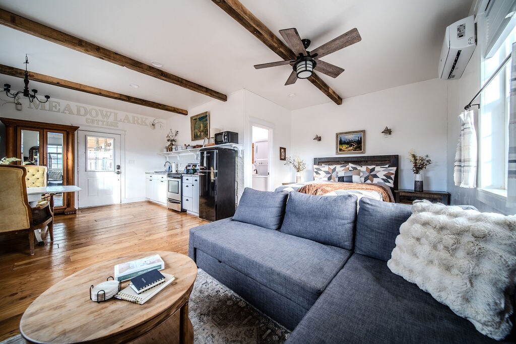 ESPACE CALME PARFAIT POUR LES VOYAGEURS ! Situé sur une propriété de 17 acres avec une vue imprenable sur des kilomètres. La petite maison d'hôtes est située sur une ferme où vous pouvez entendre le caquet des poulets ou le grognement des cochons selon la saison. Vous aurez de l'intimité en franchissant la porte dans une cour clôturée isolée. La location est conçue pour les minimalistes tout en offrant tout le nécessaire pour profiter de vacances ou d'un espace calme pour travailler.