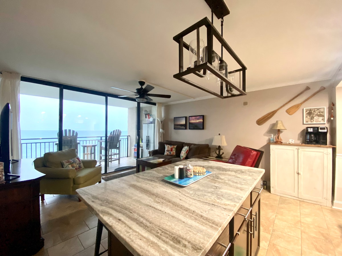 Bienvenue à « The Reach at the Beach » ! Situé au 17e étage d'Ocean Forest Plaza, à Myrtle Beach, en Caroline du Sud. Notre appartement a été entièrement rénové du haut en bas. Il s'agit d'un véritable appartement d'une chambre avec un grand lit king size, une vasque et un lavabo supplémentaires, ainsi qu'une douche de style spa avec un sol en pierre de rivière et une pomme de douche à effet de pluie. La nouvelle cuisine entièrement équipée dispose de tous les appareils en acier inoxydable, de plans de travail en îlot et en quartzite. D'autres caractéristiques sont de grandes chaises sur le balcon, une cheminée et des vues imprenables !