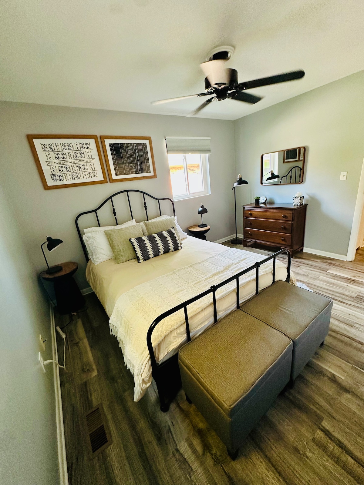 Amusez-vous avec toute la famille dans ce logement chic. Maison confortable, propre et rénovée du centre-ville de Fairborn, à quelques minutes de Wright, Patterson, de la base aérienne, du musée de l'Armée de l'air et de l'université d'État Wright. Profitez de votre séjour dans un salon confortable avec une télévision grand écran. Deux chambres avec un lit queen size et un lit king size qui est un lit réglable. Une cuisine avec tout ce dont vous aurez besoin pour le petit-déjeuner, le déjeuner ou le dîner. La maison dispose de la climatisation/chauffage central et de ventilateurs de plafond dans le salon et dans les chambres.
