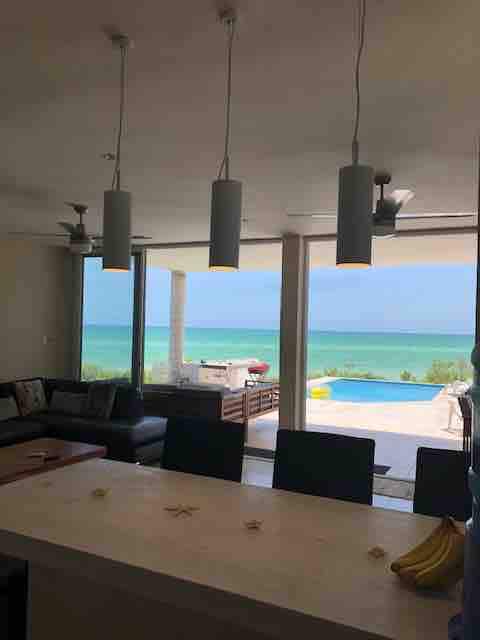 Excellente maison face à la mer à 6 km à l'est de Sisal, nouvelle, piscine, 3 chambres climatisées, entièrement équipée, wifi, télévision. Terrasses au premier et deuxième niveau avec une vue spectaculaire sur le golfe du Mexique. Une chambre a des superposés. Deux chambres ont chacune un lit king.
