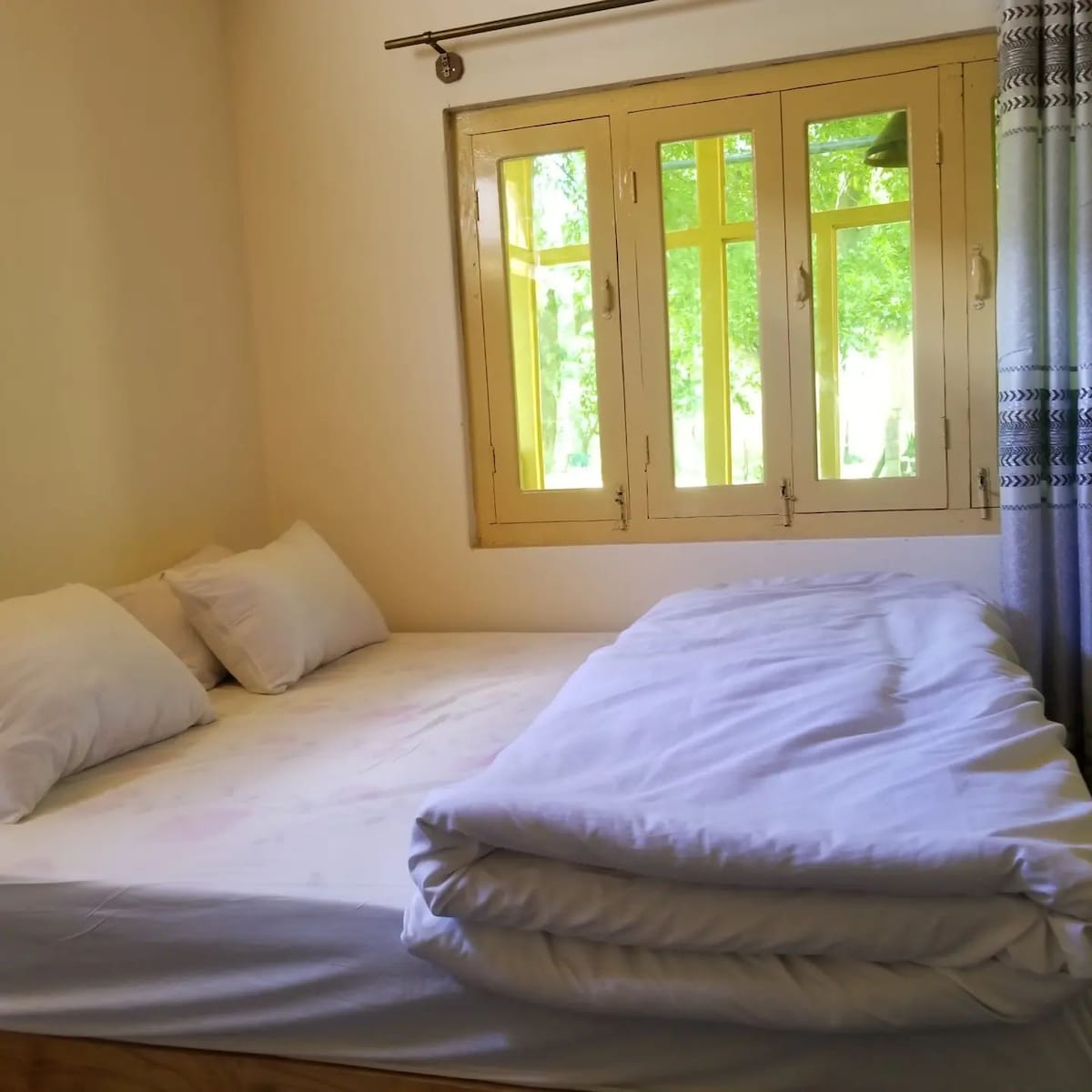 "Wake up to the fresh scent of Hunza’s orchards. This garden-view room offers a comfy double bed plus a single or sofa bed, ideal for couples or small families. Enjoy your private sitting space, lush surroundings, and the warm hospitality of Punjab Hotel just steps from Aliabad Bazaar.