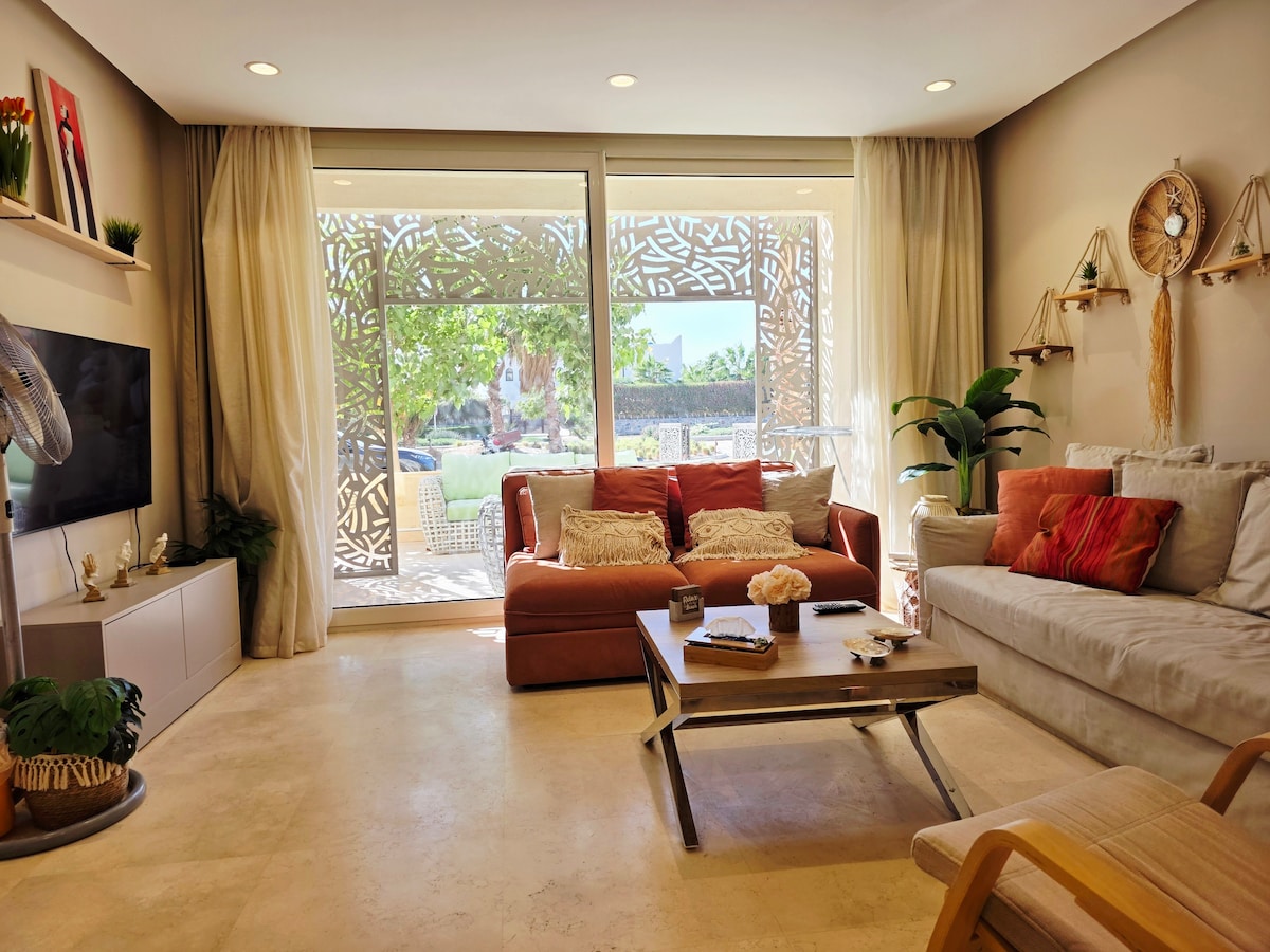 Profitez d'un chalet confortable mais spacieux au rez-de-chaussée, situé dans un quartier calme appelé « West Golf » qui est à 10 minutes de la célèbre marina et à 7 minutes du centre-ville en toktok ou en voiture. Prenez votre café du matin sur une terrasse ensoleillée donnant sur une belle vue. Ou commencez votre journée par une baignade matinale dans la piscine ou le lagon qui sont devant l'appartement N'hésitez pas à me contacter pour toute question avant de réserver. Je parle arabe, anglais et allemand.