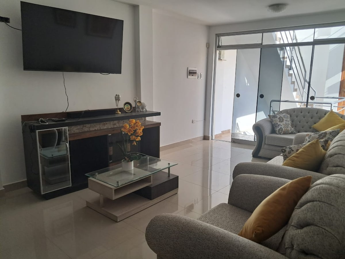 Bienvenue dans notre logement cosy et confortable à Ica, idéal pour les familles, les amis et les voyageurs avec ou sans animaux de compagnie. Situé dans une copropriété privée et sécurisée 24 heures sur 24, cet espace a été conçu pour que vous vous sentiez comme chez vous dès le premier instant. À seulement 8 min des marchés et des restaurants, à 12 min du centre d'Ica et, approximativement, à 20 min de la Huacachina, ce logement vous offrira ce dont vous avez besoin pour profiter d'un voyage incroyable.