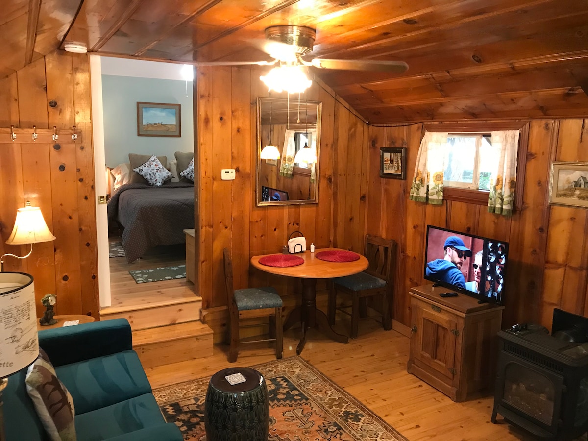 Très confortable et abordable 1 chambre plus salon, avec lit queen. La tanière/le bureau dispose d'un joli lit queen size et d'un espace bureau. La cabane dispose d'un salon confortable avec cheminée/cuisinière à gaz, coin repas et cuisine . Ce logement est conçu pour un couple, mais dispose également d'un canapé-lit. Remontez le temps et séjournez dans cette cabane rustique classique. Un joli patio extérieur et un parking désigné sont également inclus. La maison dispose de fenêtres de poche uniques et d'une baignoire profonde. Profitez de la vie sous les pins. Permis n °003128