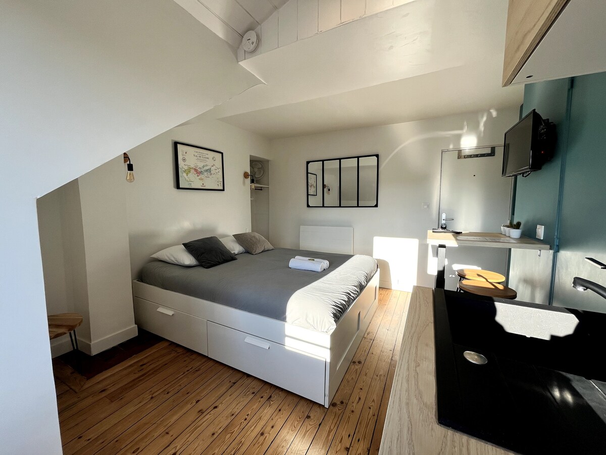 Notre studio ,refait à neuf,est idéalement placé au pied de la Cathédrale pour visiter Nantes .Vous apprécierez son calme ,son confort et la vue imprenable sur les toits et clochers de la ville .Vous êtes à proximité du Château,comme des Bords de l’Erdre ,ainsi que du centre ville et des centres d’ intérêts, tels que le Musée des beaux arts ou le Jardin des Plantes. Nous fournissons les draps et les serviettes de bain . Au plaisir de vous accueillir