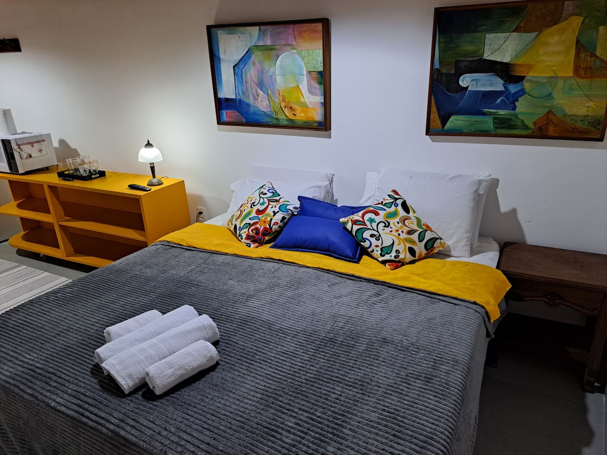 Suite (chambre et salle de bain), avec lit queen-size, climatisation, télévision 40" (Globoplay, Netflix et Prime Video), minibar, micro-ondes, cafetière, grille-pain, ventilateur, sèche-cheveux, fer à repasser, lampe de lecture, éclairage de secours. Prato, tasse, verre, couverts, ouvre-vin, torchon et linge de lit et de bain. Pour 2 personnes. Espace extérieur à l'entrée avec douche, robinet pour se laver les pieds, table et chaises. WC avec douche électrique. Indication des livraisons.