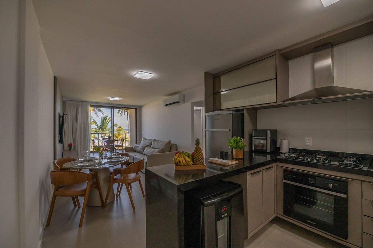Appartement dans un logement fermé avec vue panoramique. Entièrement équipé. Situé au sud, sur la célèbre plage « praia dos millionários. Tout est neuf, bâtiment, mobilier,, linge de lit et serviettes. Offrir du confort et de la commodité. 2 suites, un lit king size, un lit double, offrant 1 matelas gonflable double pour 2 personnes de plus. À proximité ; Supermarchés, restaurants, bars, boulangerie, pharmacie, aéroport ; ville d'Ilhéus. Piscine. Salle de sport, sauna et salle de jeux. Sécurité 24h/24, 2 stationnements.