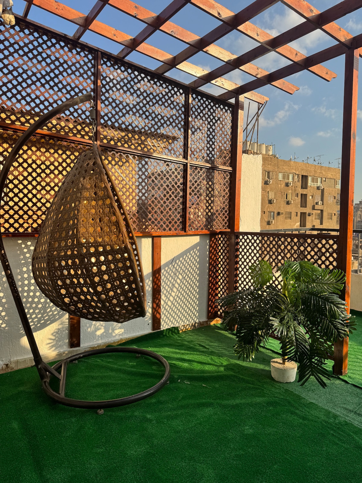Il s'agit de l'appartement 4 de notre complexe de 6 unités, dans lequel toutes les unités ont accès à un toit partagé qui dispose d'un jacuzzi extérieur, d'une balançoire extérieure et d'une table de pique-nique. Appartement écologique récemment rénové situé dans un endroit très privilégié et calme à Zamalek, un endroit très stratégique pour les clients qui souhaitent visiter certaines des attractions les plus populaires du Caire. L'appartement est équipé de tous les appareils électroniques de luxe nécessaires et offre une vue magique sur un jardin et une piscine.
