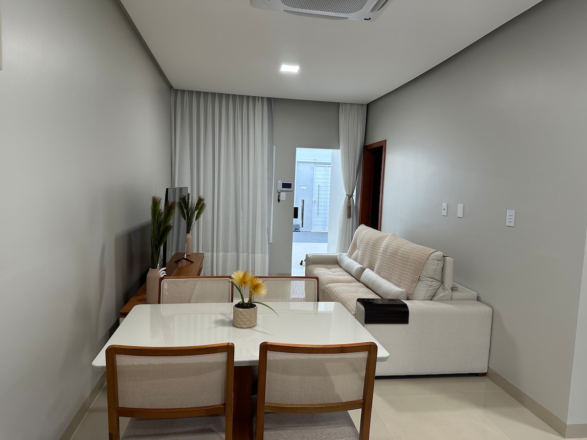 Maison confortable, avec bureau, chambre, cuisine, salon et buanderie. Wi-fi. Situé dans le quartier de Juçara. Tout est à proximité : supermarché, restaurant, centre commercial, boulangerie, pharmacie, opticiens, cliniques médicales, blanchisserie et autres. Suite avec lit double confortable, climatisation, douche électrique. Jusqu'à 2 matelas supplémentaires sont disponibles, avec des oreillers, des draps et des serviettes, qui peuvent être ajoutés à la demande du client, moyennant des frais.