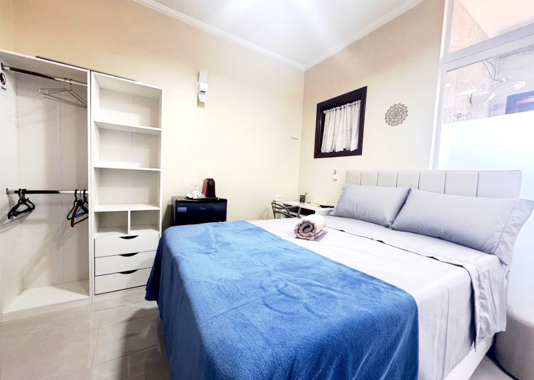 Appartement complet et confortable avec climatisation et télévision dans le salon et la chambre. Peut accueillir jusqu'à 5 personnes avec un lit queen, un divan-lit et un matelas supplémentaire. Cuisine compacte avec minibar, évier et ustensiles. Wi-Fi, piscine, centre de remise en forme, garage avec voiturier et nettoyage quotidien inclus. Enregistrement avec une boîte à clé sécurisée.