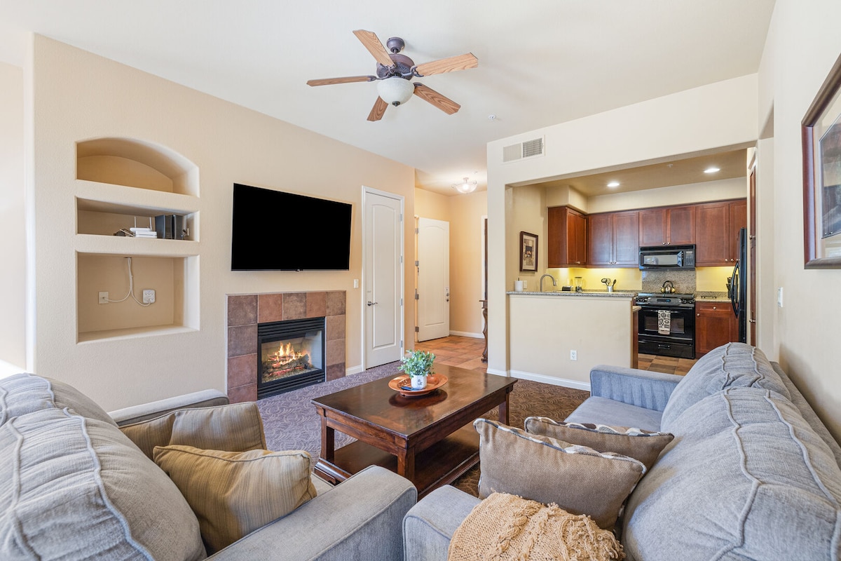 Bienvenue dans cet appartement privé récemment rénové. Le séjour dispose de nombreux sièges confortables, d'un foyer au gaz et d'une télévision connectée. Dégustez une tasse de café ou préparez votre repas préféré dans la cuisine équipée. La chambre dispose d'un lit King Size californien richement aménagé pour votre confort. Profitez du plein air sur votre patio privé, rafraîchissez-vous dans l'une des nombreuses piscines du complexe ou admirez le coucher de soleil depuis le jacuzzi. La propriété se trouve à quelques pas de la vieille ville. *Accessible en fauteuil roulant. Contactez-nous pour plus de détails.