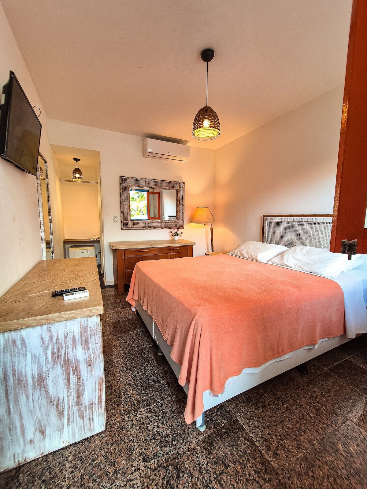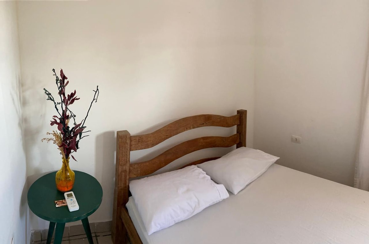 La Habitación Doble NANICA es cálida, luminosa y acogedora, ideal para parejas o personas que viajan solas y buscan descanso y tranquilidad. Cuenta con una cama matrimonial, aire acondicionado y ventilador de techo. Su decoración sencilla y natural crea un ambiente sereno, pensado para bajar el ritmo y relajarse después de un día de mar. Forma parte de Espacio Mangará, a tan solo 250 metros de la playa, un espacio donde recibimos huéspedes como amigos. Fica na paz.