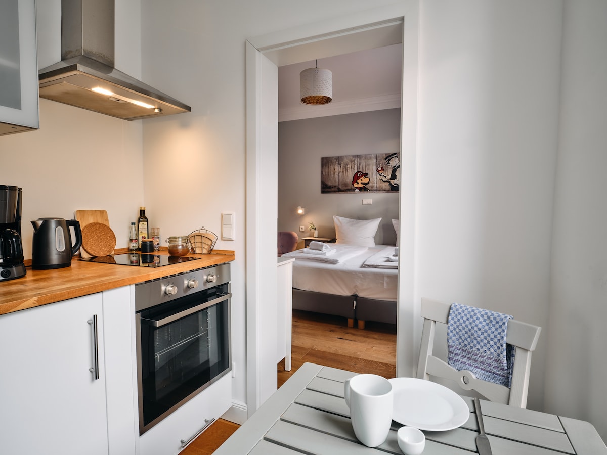 Avec environ 23 mètres carrés, c'est le plus petit - l'appartement « confortable » pour une personne, soyez heureux pour 2, quand le 140 lit, il est assez grand pour vous. Néanmoins, tout est là pour se sentir à l'aise à la fois : une mini-cuisine entièrement équipée et ultra moderne avec machine à expresso, une télévision à écran plat, une connexion sans fil, un coffre-fort mural, un peu de travail et une salle de bain élégante. Le chauffage par le sol assure un climat agréable de la pièce et les rideaux occultants pour un sommeil paisible. L'appartement dispose d'une entrée privée avec un petit patio à l'extérieur. Ici, vous pouvez passer des heures à vous détendre dans le jardin.