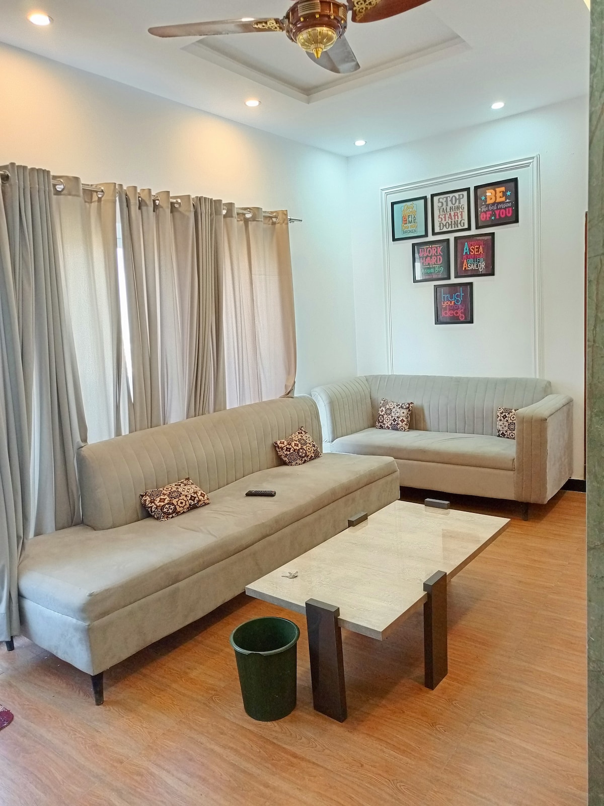 Electricity bill charged seperately based on actual use Bring the whole family to this great place with lots of room & get to be located in the best gated community of the city. -24 Hour Check-in -Daily cleaning -400m Bahria food street -60+ Restaurants around -24/7 Reception & pro hospitality staff -Completely independent -Spacious -Window w/ city view (gets great sunlight) -ACs in Rooms & lounge (heating & cooling) -LED TV -Fully-equipped Kitchen (on req. gas) -No elevator (2nd floor)