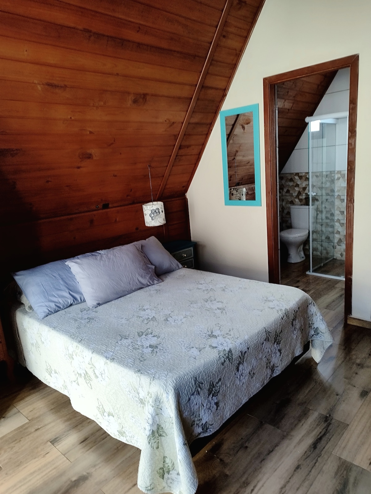 Chalet confortable avec vue privilégiée sur la montagne décoré dans le style balinais, avec une atmosphère zen pour que vous ayez un contact avec la nature et vous détendiez en appréciant notre petit déjeuner super spécial inclus dans l'hébergement. Situé à 5 min de Vinícola Góes, Cantina da Tia Lina et Dream Car, à 10 min de Vila Don Patto et Quinta do Olivardo et à 15 min du centre de São Roque. Il y a 10 chalets duplex identiques dans la structure, ne changeant que quelques détails dans la décoration, tous également beaux.