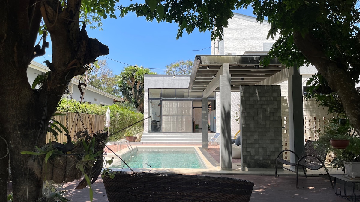 La maison dispose d'une piscine chauffée, maintenue à 23 à 30 degrés (selon le climat, c'est-à-dire que le soleil détermine la température), d'un spa écologique avec chauffage électrique (40 degrés), d'un barbecue américain, de 2 chambres (1 suite avec lit queen et une autre avec 2 lits superposés), d'un salon, d'une télévision avec Netflix, d'une connexion Internet Wi-Fi, d'une salle à manger intérieure (table avec 4 chaises) et d'une salle à manger extérieure, de 2 salles de bain (1 d'entre elles dans la suite), d'une cuisine entièrement équipée. Le condominium offre un terrain de jeu pour les enfants. Site rustique moderne.