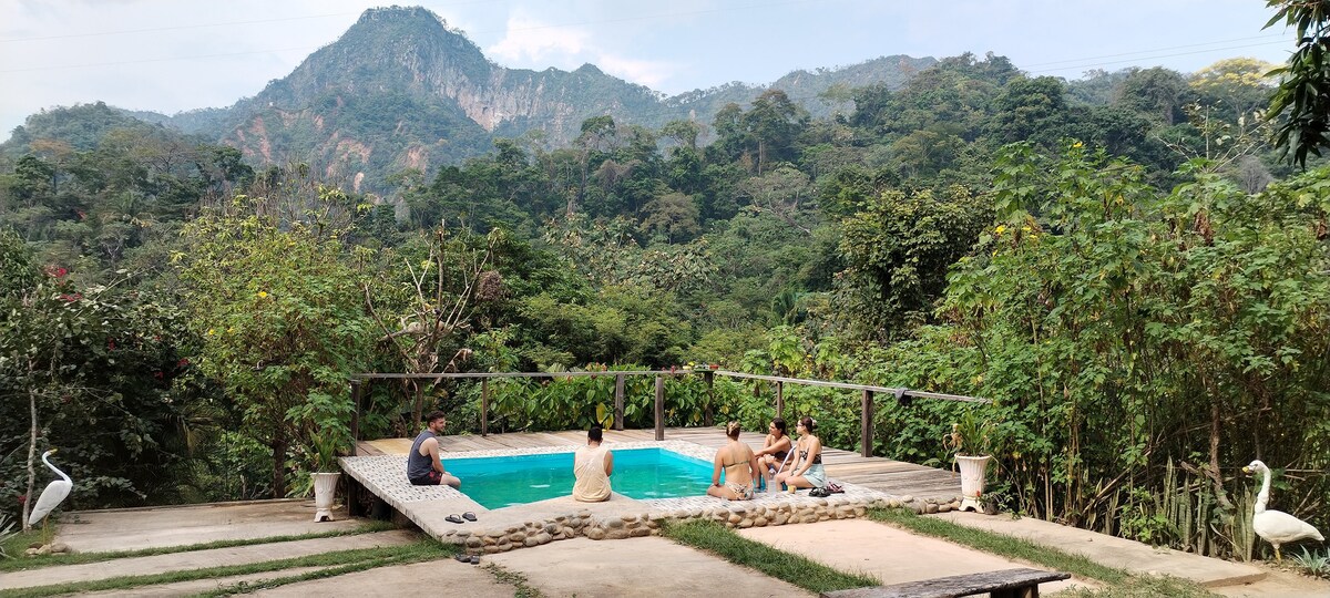 Enjoy a relaxed atmosphere, connected with nature and incredible views. The accommodation has 5 rooms, with air conditioning and fan, each room has a double bed It includes a free pool and free kitchen. We also have a medicinal sauna at 30 Bs per person, canopy or zip line 30 Bs per person. Free walk to the waterfall and if you want to go with a guide 30 Bs per person, camping área a 50 Bs por persona