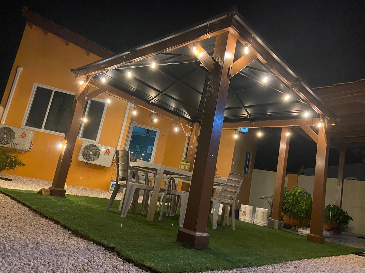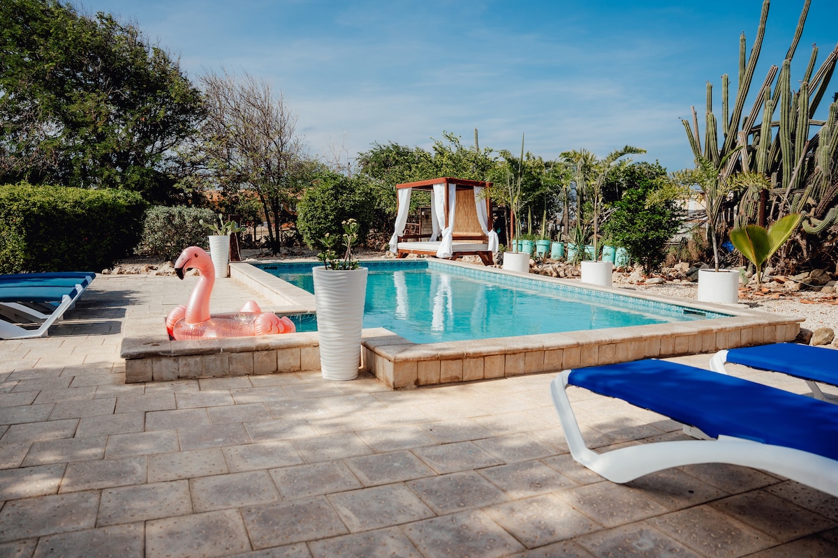 Détendez-vous dans ce logement unique et tranquille dans un cadre arubais authentique. Les espaces de vie extérieurs sont tout simplement incroyables alors que vous vous immergez entièrement dans des espaces de détente entourés de la faune locale, de hamacs, de lits de jour, de chaises modernes, de deux espaces barbecue et de différentes piscines ! La nuit devient encore plus belle lorsque tous les éclairages LED s'allument automatiquement, vous permettant de profiter de la belle brise des Caraïbes 24 heures sur 24 ! Séjourner dans un véritable appartement cunuku sur le thème d'Aruba ajoute également à l'authenticité !