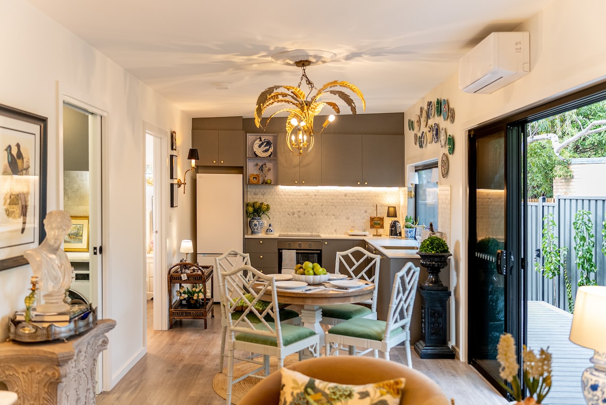 Ce chalet de 100 ans pour les travailleurs est entièrement dédié aux intérieurs sur mesure. Les murs et les étagères sont remplis de magnifiques œuvres d'art, la maison dispose de pièces vintage spécialement sélectionnées et dispersées partout, les lits sont remplis de draps luxueux et le salon dispose d'un canapé 3 places dont vous ne voudrez peut-être plus jamais vous lever. Idéalement situé, en face des marchés de South Melbourne, à distance de marche du lac Albert Park et à quelques minutes en tramway du quartier des affaires. Remarque : pas de télévision, alors apportez des appareils si nécessaire.